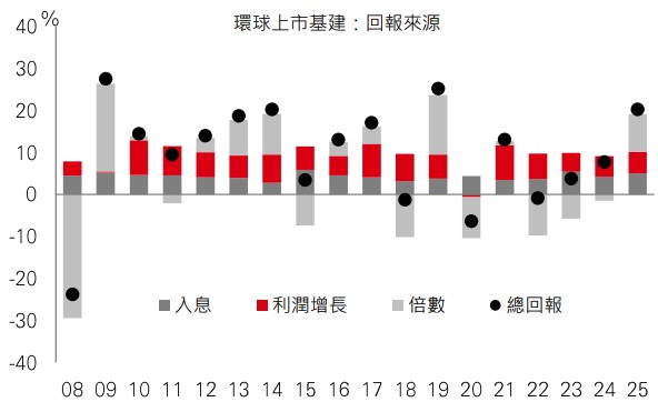 這主要有三大原因。首先,基建股票是一些重要長遠市場主題的支柱,例如人工智能超級周期和電力需求。其次,基建股票受到投資者青睞,因近期投資者由昂貴的美國科技業,輪動至更可預測的資產密集型行業(如公用事業和能源)。第三,基建向來是市場內偏向防守性的板塊,對周期行業波動的敏感度較低。因此,在充滿不確定性和波幅的環境下,對比其他市場領域(包括債券和黃金等傳統避險資產),基建股票的可靠現金流和股息或許更具吸引力。