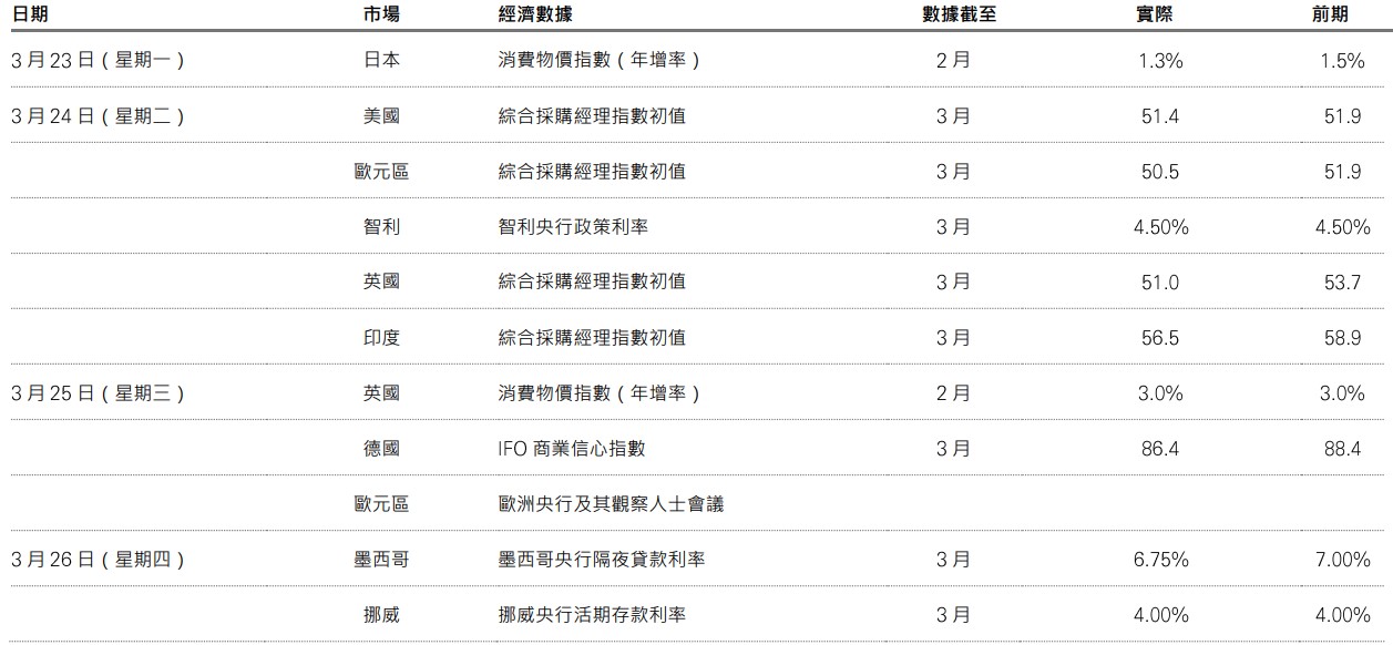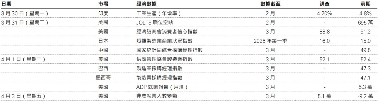 過往表現並非未來回報指標。息率水平不獲保證,日後可升或可跌。僅供參考,不應視為投資特定國家、產品、策略、行業或證券的建議。多元化並不能確保盈利或防止虧損。所表達的任何觀點均截至編製為止,如有更改,恕不另行通知。指數回報假設所有分派再投資,不反映費用或開支。您不能直接投資於指數。所提供的任何預測、預計或目標僅供參考,概非任何形式保證。資料來源:滙豐投資管理、Macrobond及彭博。數據截至2026年3月27日(英國時間上午7時30分)。