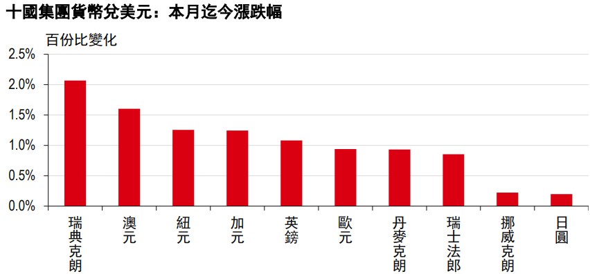 進入12 月以來,瑞典克朗的表現領先十國集團貨幣,澳元、紐西蘭元及加元緊隨其後(詳見下圖)。這一趨勢反映出美元兌十國集團貨幣普跌(請參見《外匯前瞻快訊:美元:聯儲局第三次減息0.25%,並提供中性指引》瞭解詳情)。