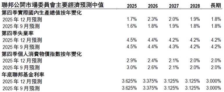 美元最初走弱是因為美國聯邦儲備局(簡稱「聯儲局」或「美聯準」)沒有釋放鷹派信號。最新「點陣圖」反映了聯邦公開市場委員會全部19 名成員的觀點,2026 年利率預測中值顯示只會再減息0.25%,而市場預期為兩次。值得注意的是,2026 年利率預測的分歧很大(預測區間為2.125%至3.875%),表明聯儲局內部對減息節奏缺乏共識。