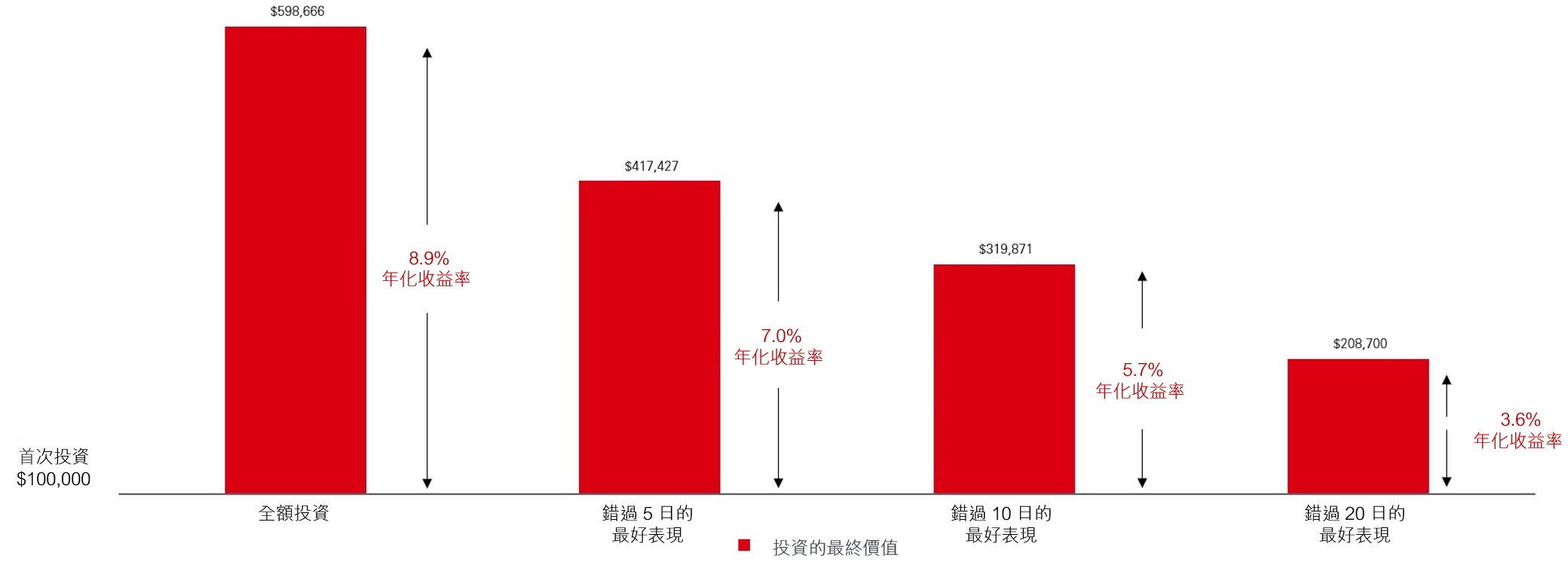 此外,若您試圖揣測入市時機,有可能會錯過某些表現最好的日子,即使僅錯過了數天,您的回報也會截然不同。圖表 3 顯示了自 2005 年以來 100,000 美元的股票投資,錯過市場最佳表現的 20 天,最終投資價值從大約 598,000美元減少至 208,700美元。
