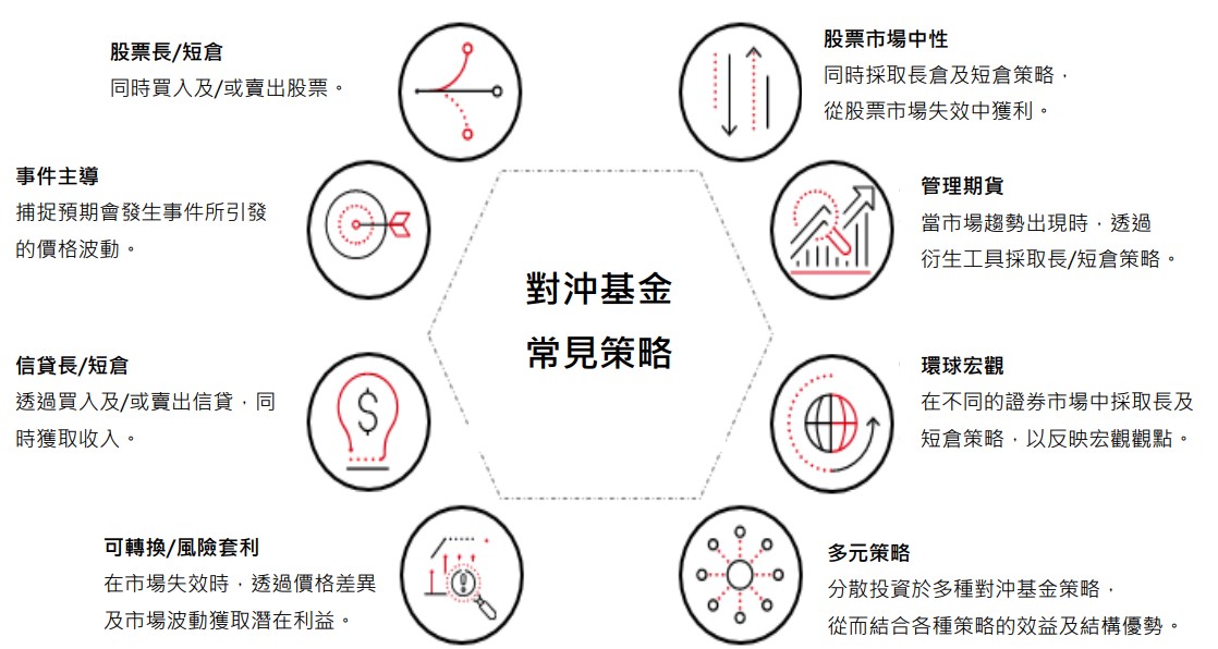 對沖基金採用非傳統的投資策略,包括長倉/短倉 (結合買入及賣出策略)、槓桿 (借貸投資)、套利(利用不同資產市場的價格差異)、交換(交換金融工具或現金流,例如固定及浮動利率) 等 ,以減低風險及提升潛在回報。這些策略與傳統資產的相關性較低,其多元化的優勢可減低投資組合的波幅,相對傳統資產或有助抗衡跌市的衝擊,並提供較佳的回報。