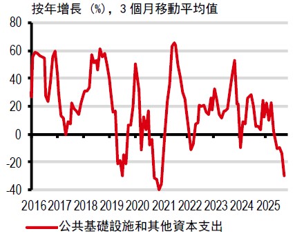 但主要癥結在於政府支出。自2016 年雄心勃勃的「大建特建」計劃啟動以來,政府基礎設施投資一直是經濟增長的重要引擎。然而,由於防洪項目相關爭議,自7 月以來公共資本支出一直在下降,按年降幅已超過20%,對經濟增長的拖累一度高達1.3 個百分點。