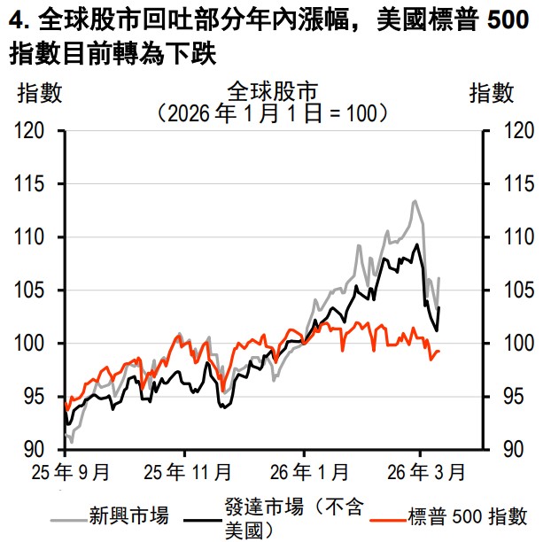 由於霍爾木茲海峽事實上已被封鎖(約20%的全球原油和液化天然氣運輸經由該海峽),全球不確定性大幅上升。能源貿易流動與產出減少一度導致油價飆升至近120美元/桶,直至美國總統特朗普表態稱戰事「基本結束、大局已定」,市場情緒才有所緩和。