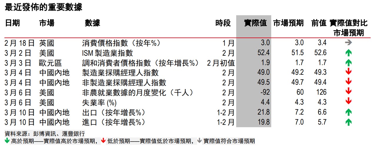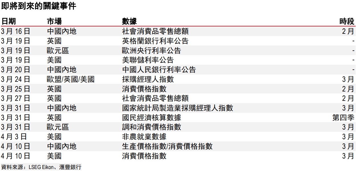 亞洲方面,中國內地1-2月貿易數據大幅走強,市場關注點聚焦於「十五五」規劃。該規劃將2026年經濟增長目標略降至4.5%-5.0%區間,並將由財政政策提供支持。政策重點包括提振國內需求、加大反內卷力度,同時平衡貿易關係。